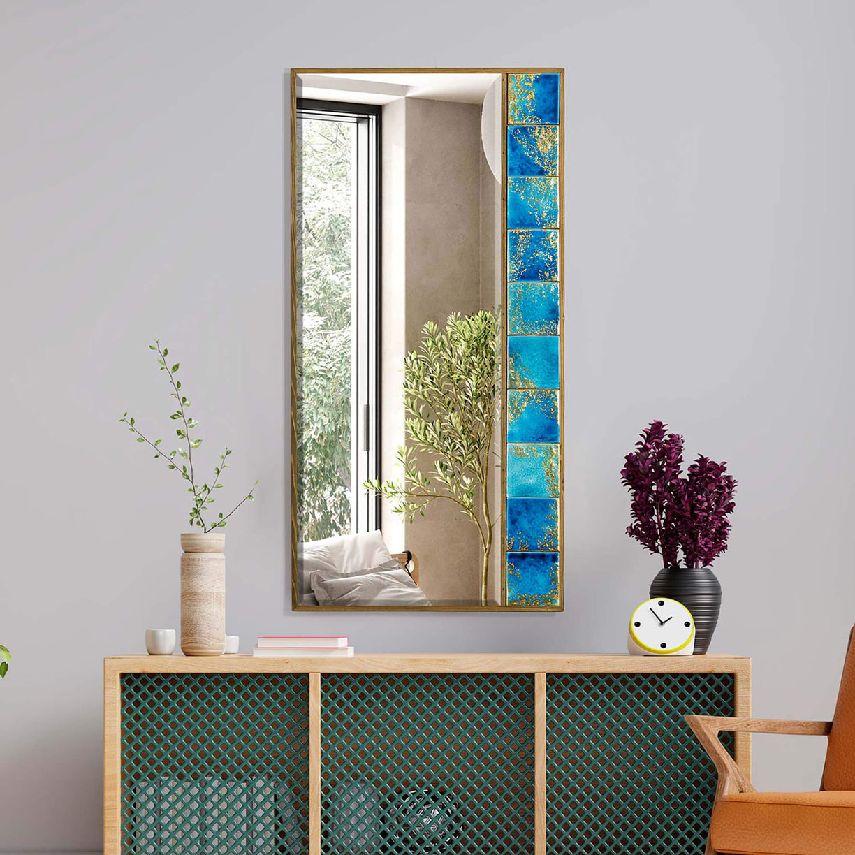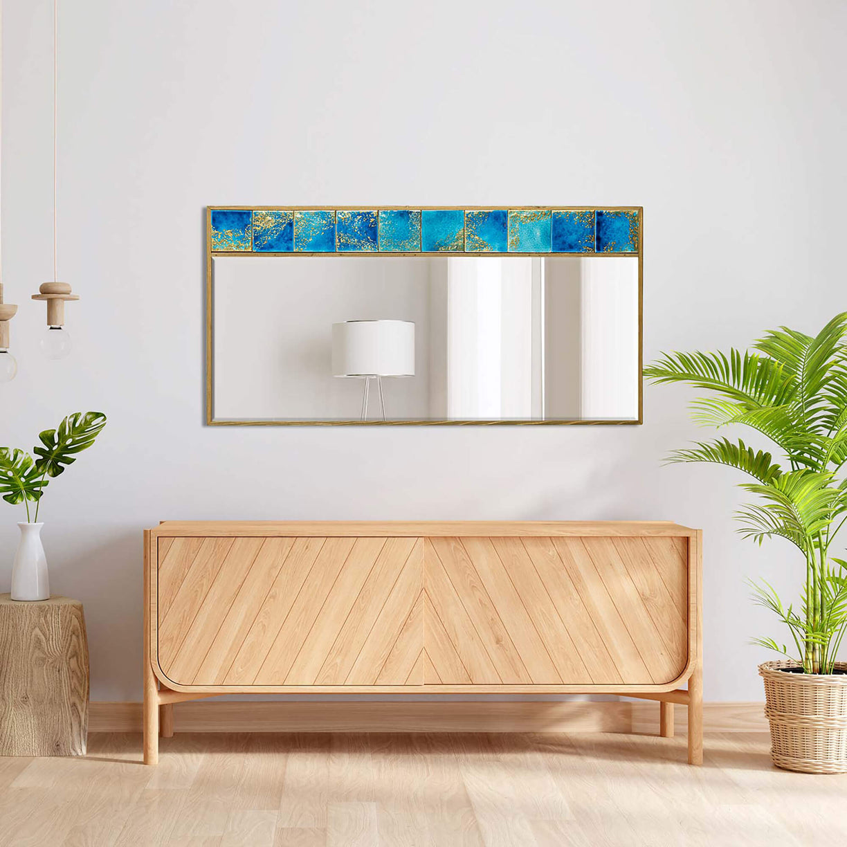 Enrich your living space with the timeless beauty of Turkish craftsmanship through our handcrafted tile mirrors. Produced in the heart of Turkey, each mirror showcases the artistry of our skilled artisans who meticulously create them from the finest tile and travertine stones. What sets our mirrors apart is the natural wood used for their frames, adding a touch of warmth and authenticity to the design. The glass of the mirror has been produced as a premium quality, ensuring clear reflections and durability. But that's not all – our tiles are as unique as your own imagination. With each model boasting distinct designs and colors, you have the freedom to seamlessly integrate them into your interior design. In our collection, you'll find an array of unique mirrors available in small, medium, and large sizes to fit your interior design needs. Whether you're searching for a charming wall hanging mirror, a sophisticated pier glass mirror, or a statement-making large size mirror, we have a mirror for every room in your home. If you're in search of a truly individual piece, we offer custom-made mirrors, though pricing may vary depending on your specifications. Elevate your space with the distinctive beauty of our handmade tile mirrors, inspired by Turkish tradition.