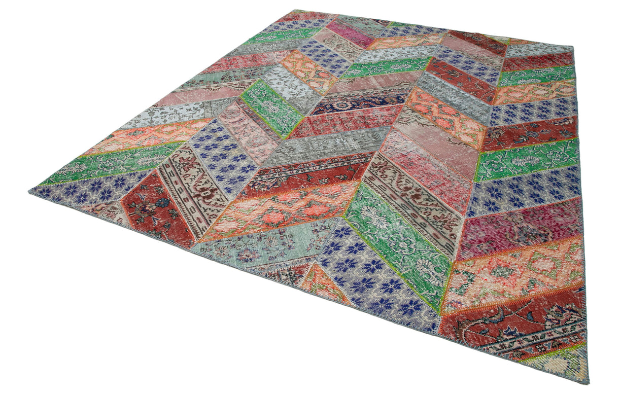 This modern patchwork rug is a striking example of Anatolian craftsmanship fused with contemporary design. Made from 30 to 50-year-old hand-knotted vintage Turkish rugs, each piece is carefully selected from Anatolia’s weaving villages, then restored, neutralized, and overdyed with natural, plant-based dyes to achieve a vibrant and cohesive palette.What sets this rug apart is its bold geometric composition. The individual fragments are cut into dynamic shapes and arranged in a symmetrical, graphic layout, showcasing sharp angles, framed blocks, and a powerful sense of rhythm. Every section retains elements of its original texture and motif, now enhanced with low pile depth and modern color contrasts.The rug is backed with buckram and cotton to ensure durability and structure, making it ideal for spacious interiors such as living rooms, dining areas, or professional spaces that benefit from a strong visual centerpiece.