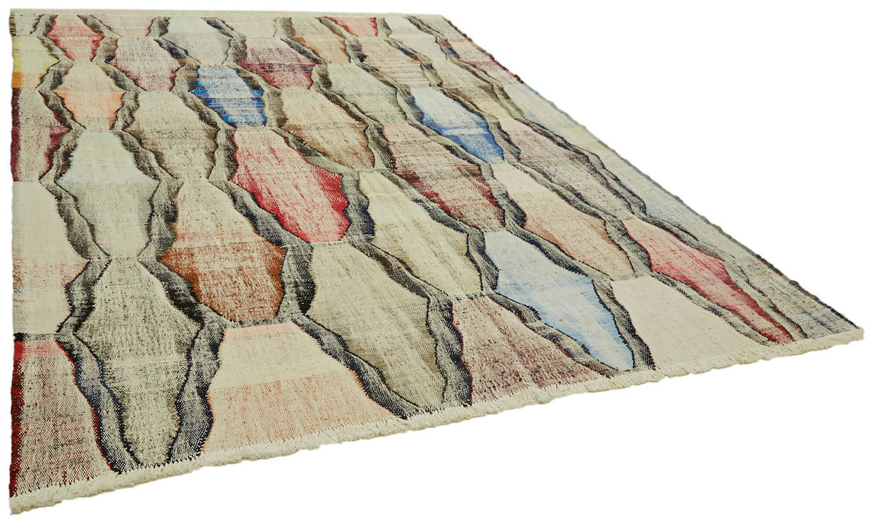 Handwoven Rag Kilim – Where Recycled Threads Meet Artistic ModernityThis stunning rag rug is a testament to how traditional craftsmanship can be reimagined into something completely modern. Created by unraveling old kilims, the cotton and fabric yarns are reborn into a fresh, bold design that reflects today’s minimal yet artistic home décor preferences.Each rug tells a story — from the old yarn once woven into vintage kilims, now transformed into a sleek and contemporary piece. The result is not only eco-conscious, but also entirely one-of-a-kind. Expect a playful mix of colors and textures, with subtle geometric patterns that provide movement and life to any space.Thanks to its lightweight and flat-woven structure, this kilim is easy to handle and style. Whether draped over a wooden floor, layered with modern furniture, or hung on a feature wall, it adds texture, color, and a handcrafted spirit to your interior.
