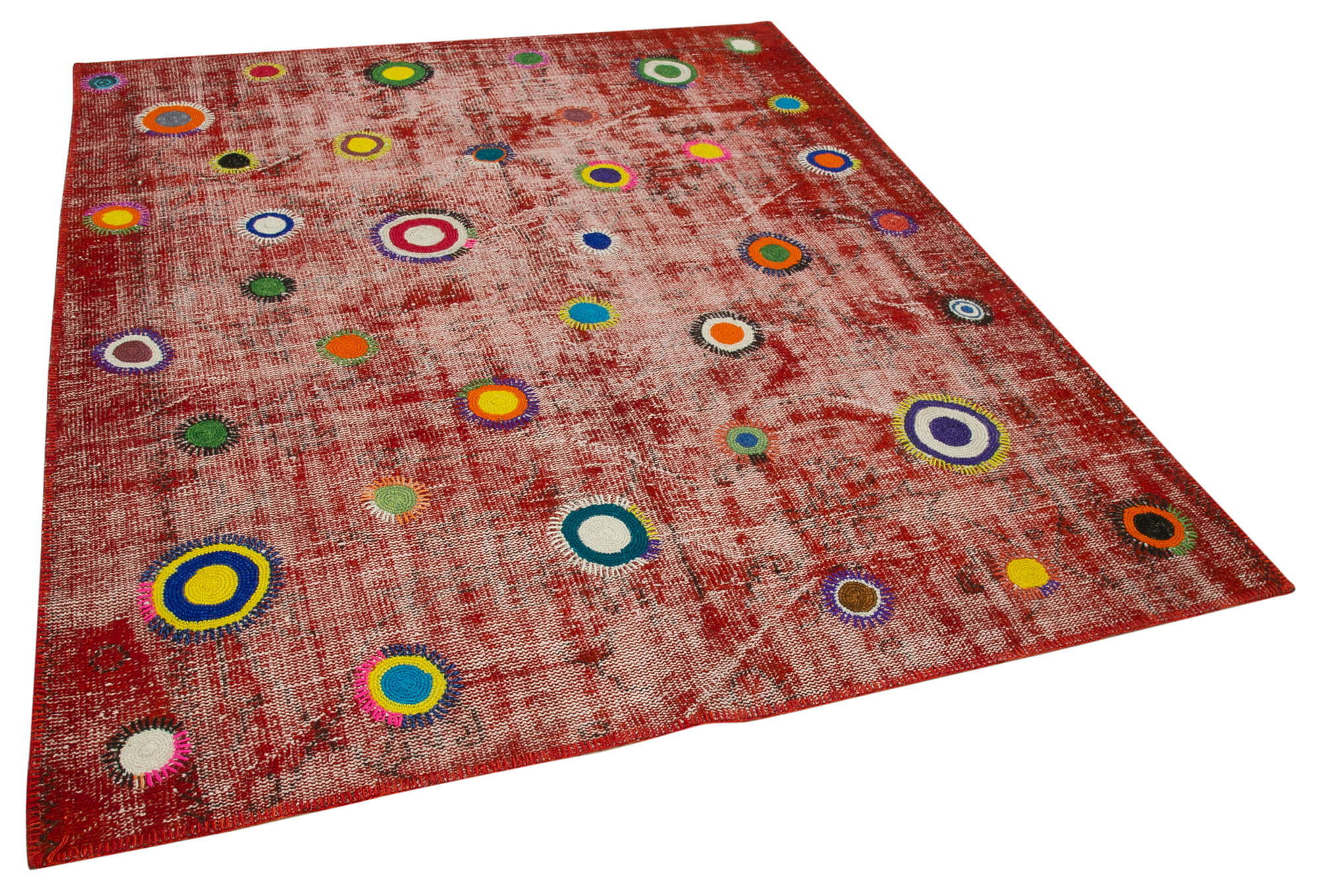 This modern patchwork rug is a striking example of Anatolian craftsmanship fused with contemporary design. Made from 30 to 50-year-old hand-knotted vintage Turkish rugs, each piece is carefully selected from Anatolia’s weaving villages, then restored, neutralized, and overdyed with natural, plant-based dyes to achieve a vibrant and cohesive palette.What sets this rug apart is its bold geometric composition. The individual fragments are cut into dynamic shapes and arranged in a symmetrical, graphic layout, showcasing sharp angles, framed blocks, and a powerful sense of rhythm. Every section retains elements of its original texture and motif, now enhanced with low pile depth and modern color contrasts.The rug is backed with buckram and cotton to ensure durability and structure, making it ideal for spacious interiors such as living rooms, dining areas, or professional spaces that benefit from a strong visual centerpiece.
