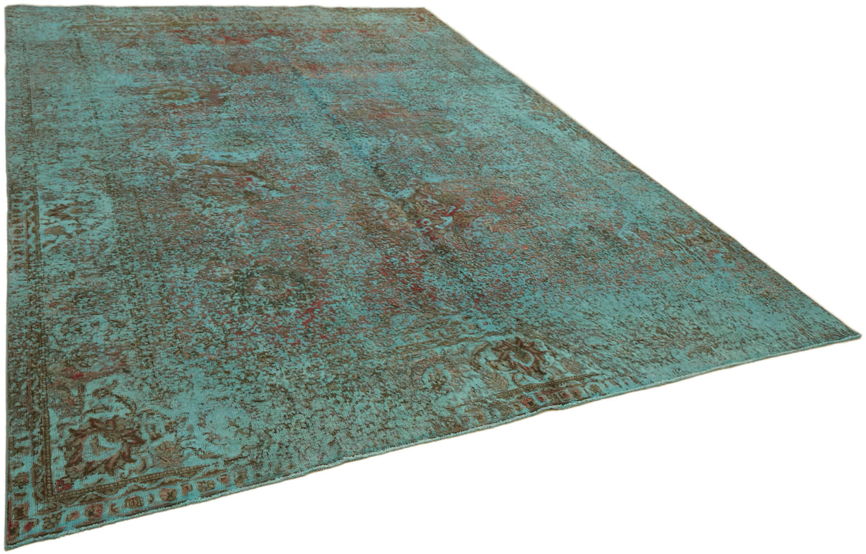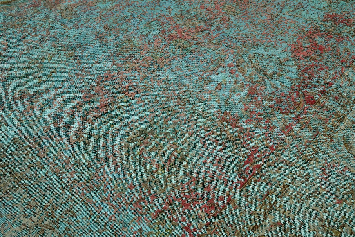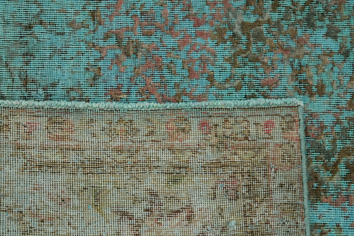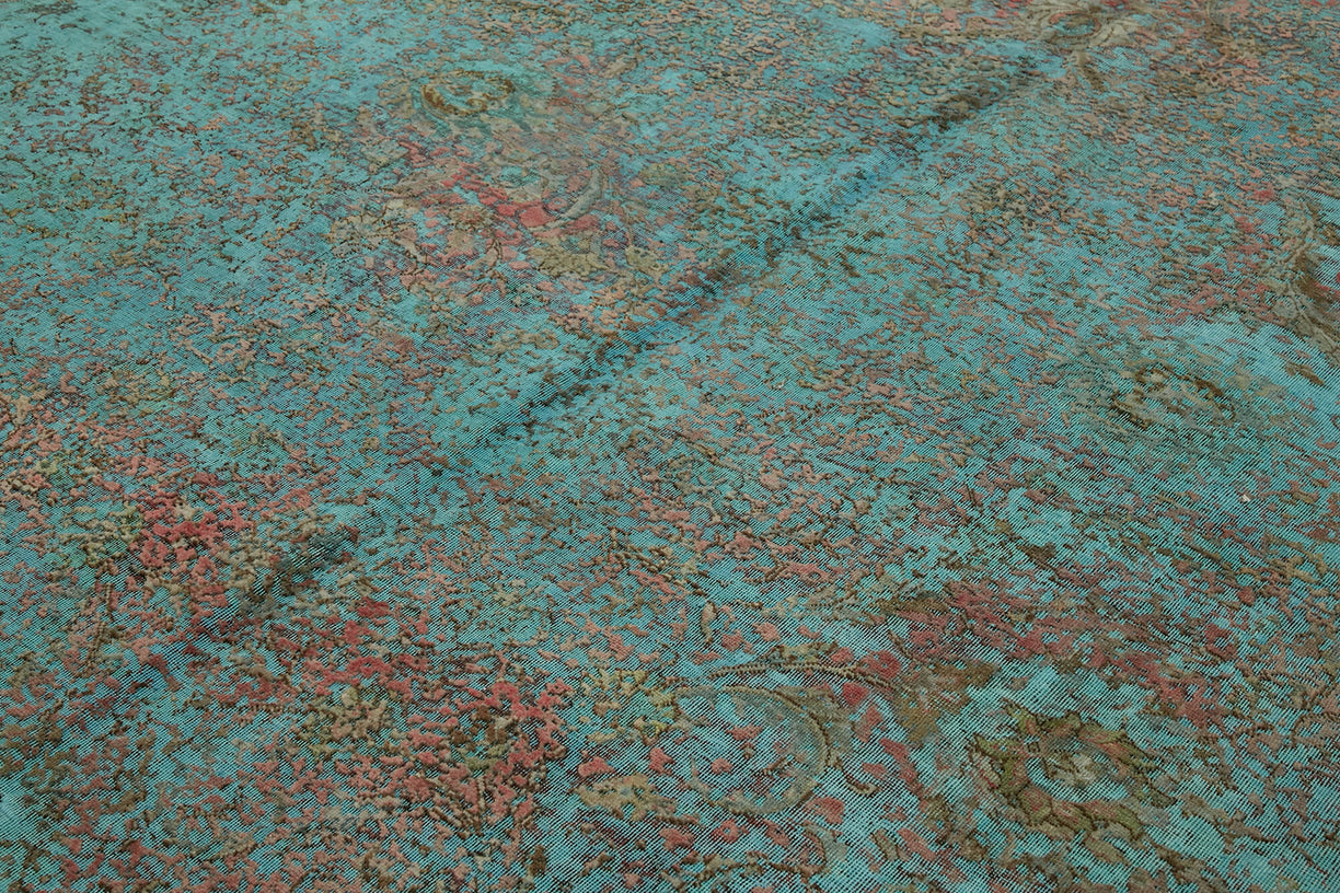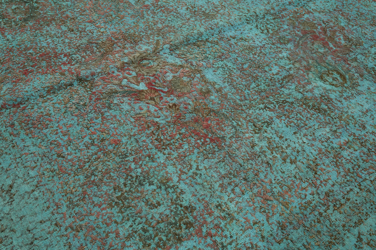 This turquoise over-dyed rug offers a contemporary look with abstract appeal, crafted from a hand-knotted vintage Oriental rug from the 1960s. it measures 9' 6'' x 12' 7''. The rug undergoes a unique process to lower the pile, desaturate the color, and achieve the perfect hue. This transformation bridges generations of artisanal skill, making it a unique statement piece for modern décor. All our vintage rugs are professionally cleaned before being added to our collection.