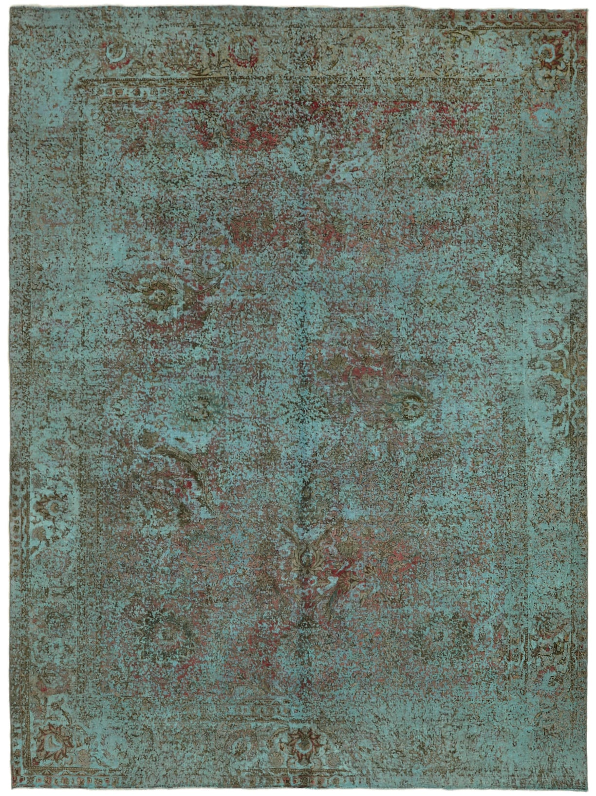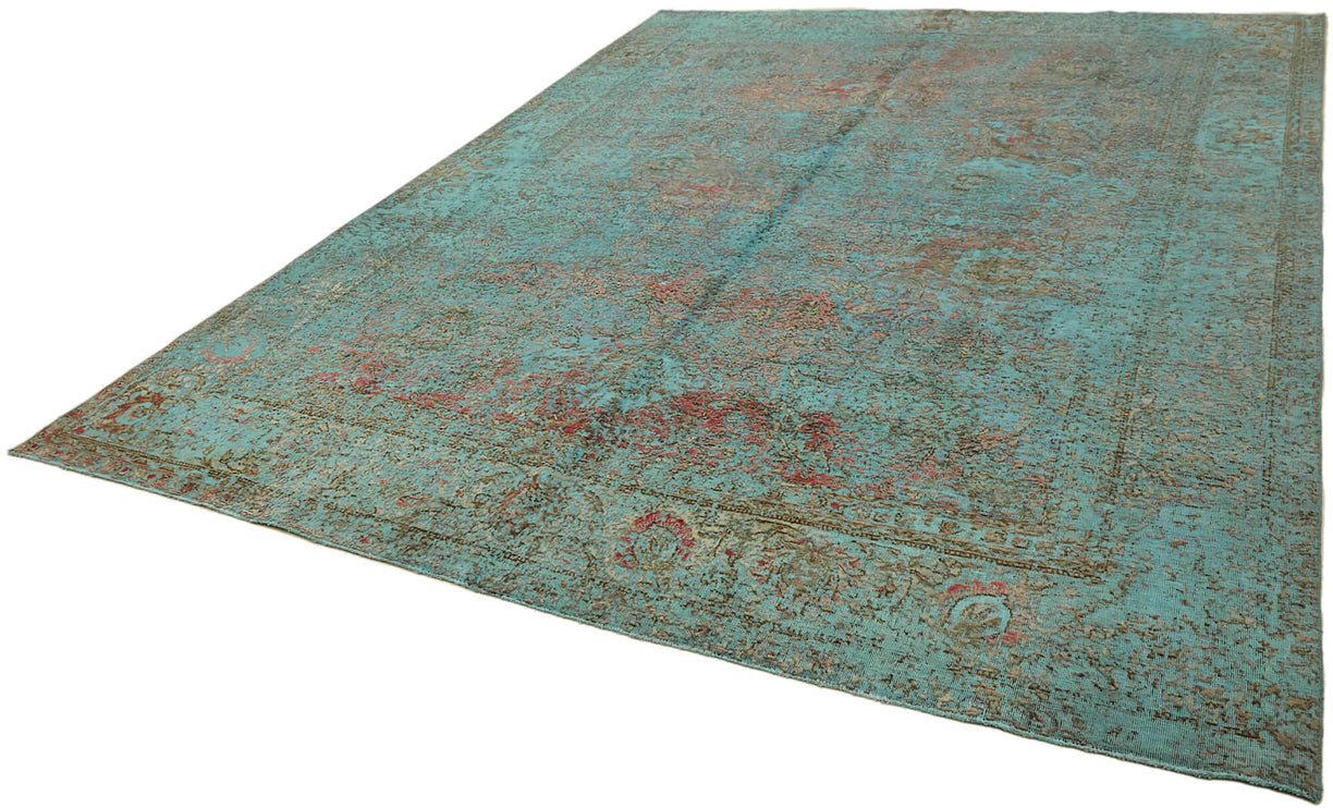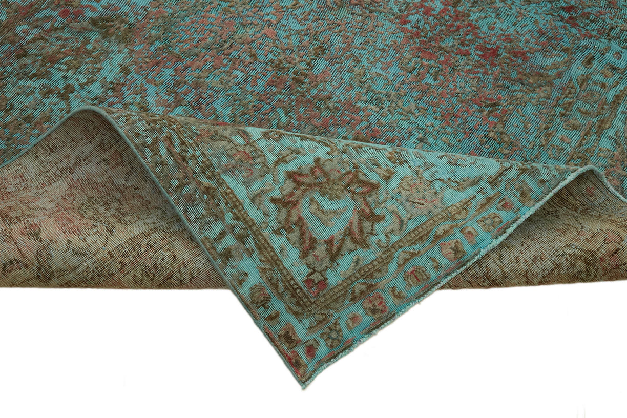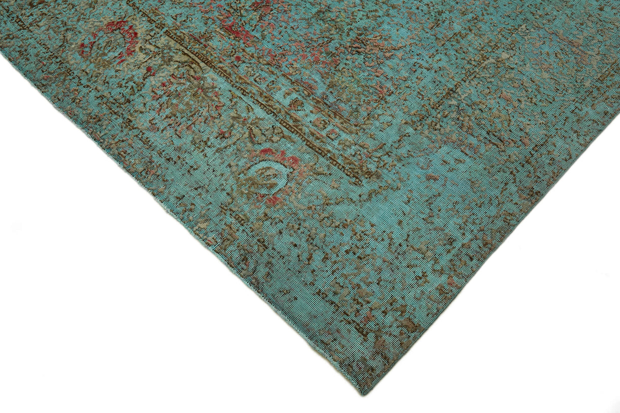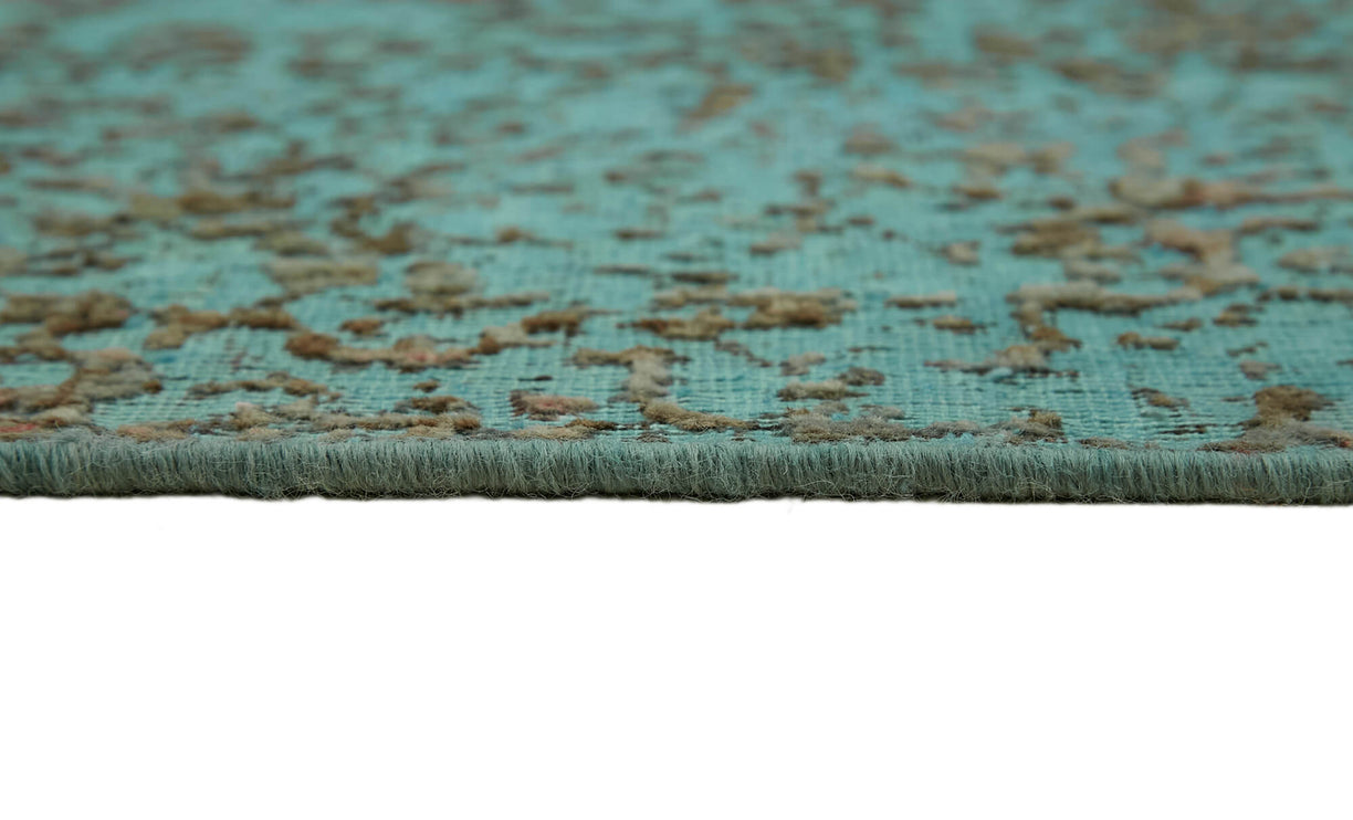 This turquoise over-dyed rug offers a contemporary look with abstract appeal, crafted from a hand-knotted vintage Oriental rug from the 1960s. it measures 9' 6'' x 12' 7''. The rug undergoes a unique process to lower the pile, desaturate the color, and achieve the perfect hue. This transformation bridges generations of artisanal skill, making it a unique statement piece for modern décor. All our vintage rugs are professionally cleaned before being added to our collection.