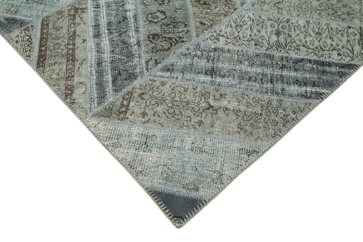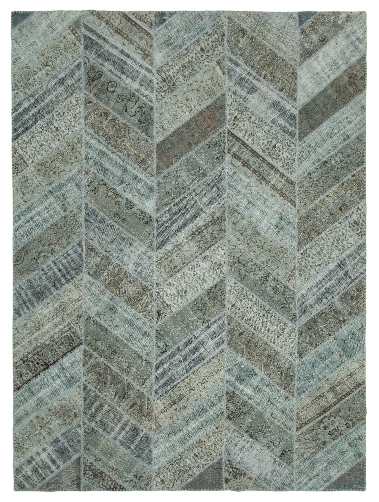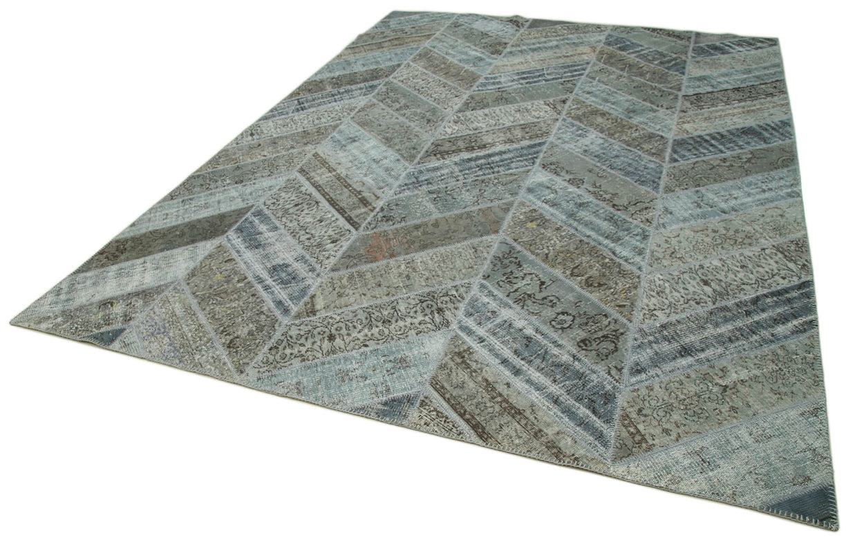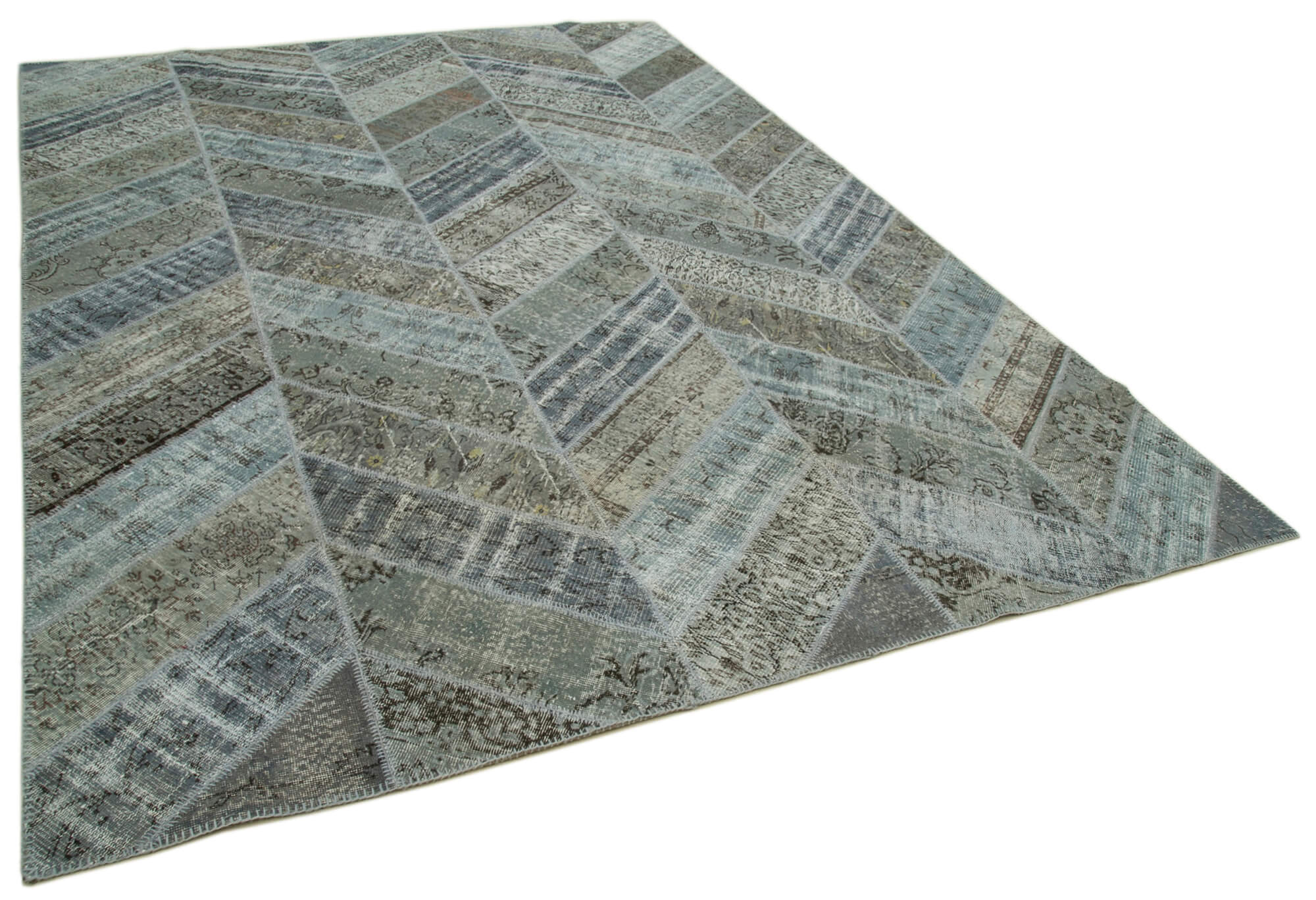 This modern patchwork rug is a striking example of Anatolian craftsmanship fused with contemporary design. Made from 30 to 50-year-old hand-knotted vintage Turkish rugs, each piece is carefully selected from Anatolia’s weaving villages, then restored, neutralized, and overdyed with natural, plant-based dyes to achieve a vibrant and cohesive palette.What sets this rug apart is its bold geometric composition. The individual fragments are cut into dynamic shapes and arranged in a symmetrical, graphic layout, showcasing sharp angles, framed blocks, and a powerful sense of rhythm. Every section retains elements of its original texture and motif, now enhanced with low pile depth and modern color contrasts.The rug is backed with buckram and cotton to ensure durability and structure, making it ideal for spacious interiors such as living rooms, dining areas, or professional spaces that benefit from a strong visual centerpiece.
