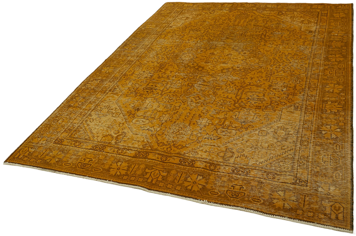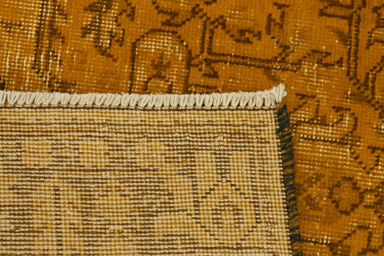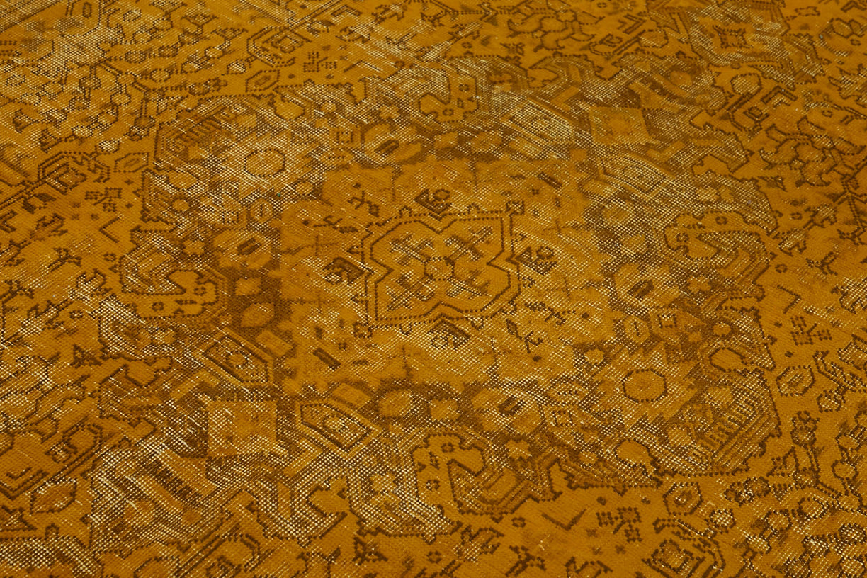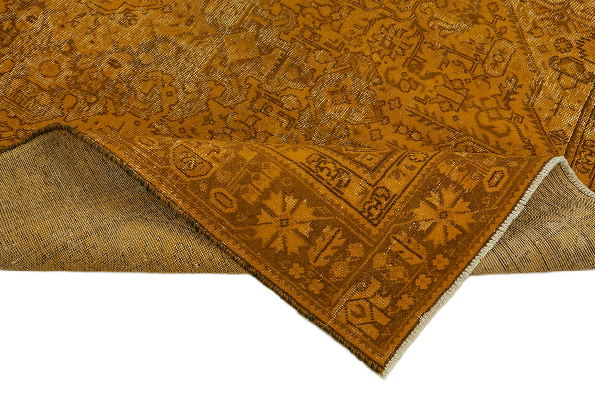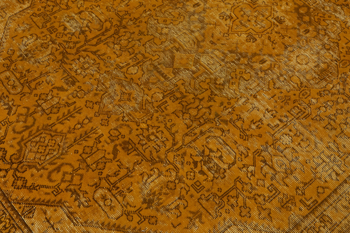 This orange over-dyed rug offers a contemporary look with abstract appeal, crafted from a hand-knotted vintage Oriental rug from the 1960s. it measures 6' 1'' x 8' 10''. The rug undergoes a unique process to lower the pile, desaturate the color, and achieve the perfect hue. This transformation bridges generations of artisanal skill, making it a unique statement piece for modern décor. All our vintage rugs are professionally cleaned before being added to our collection.