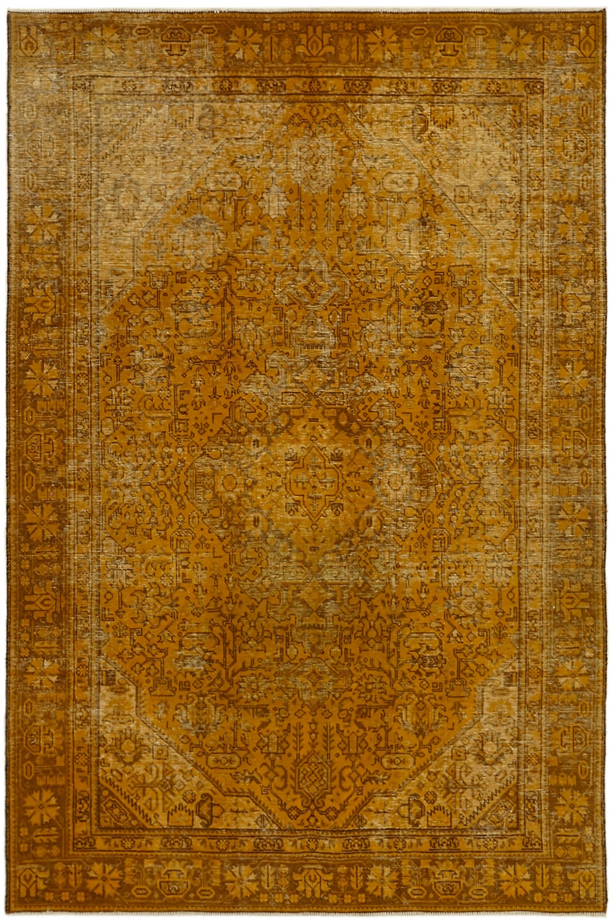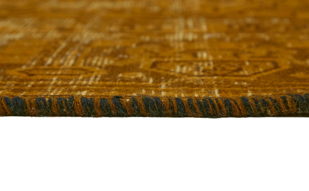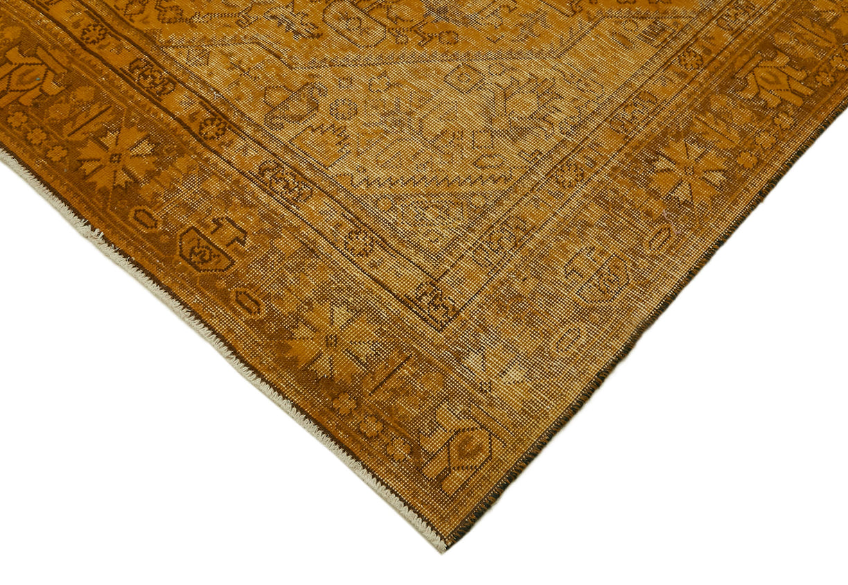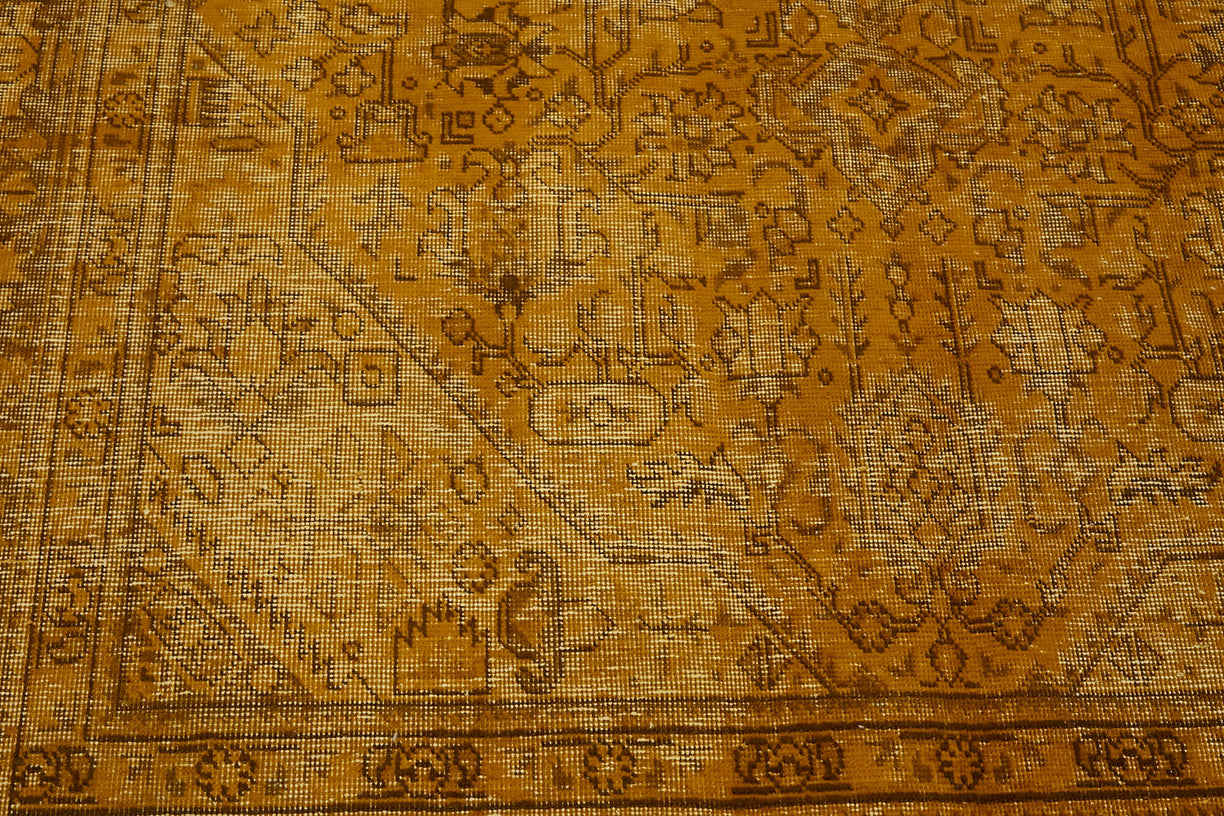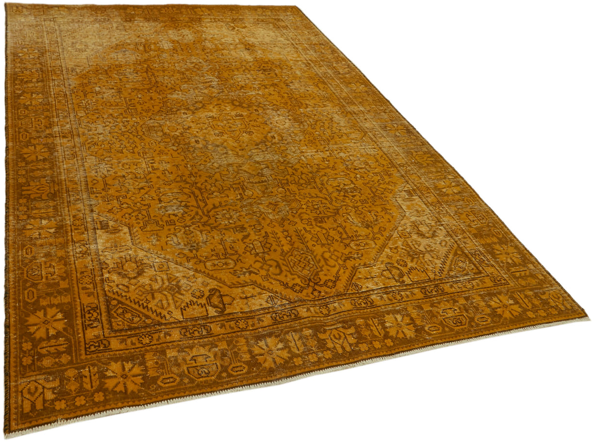 This orange over-dyed rug offers a contemporary look with abstract appeal, crafted from a hand-knotted vintage Oriental rug from the 1960s. it measures 6' 1'' x 8' 10''. The rug undergoes a unique process to lower the pile, desaturate the color, and achieve the perfect hue. This transformation bridges generations of artisanal skill, making it a unique statement piece for modern décor. All our vintage rugs are professionally cleaned before being added to our collection.