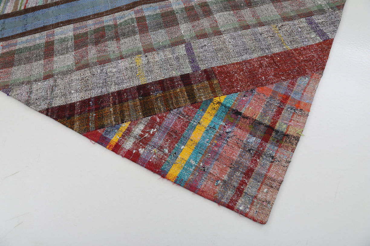Colorful patchwork rug crafted from vintage Turkish 'chaput' fragments, also known as rag rugs. These unique Turkish chaput kilims are flatweaves handmade from recycled cotton, wool, and goat hair fabrics. Originally woven on narrow looms, chaput panels were later sewn together to create two or even three-winged reversible rugs. Chaput weaving, a traditional practice in Asia Minor, creatively reuses old textiles, forming eco-friendly, one-of-a-kind pieces with rich color and texture. Historically used as runners, area rugs, or bed covers, each vintage chaput patchwork rug showcases an authentic palette, unredyed and rich in character.