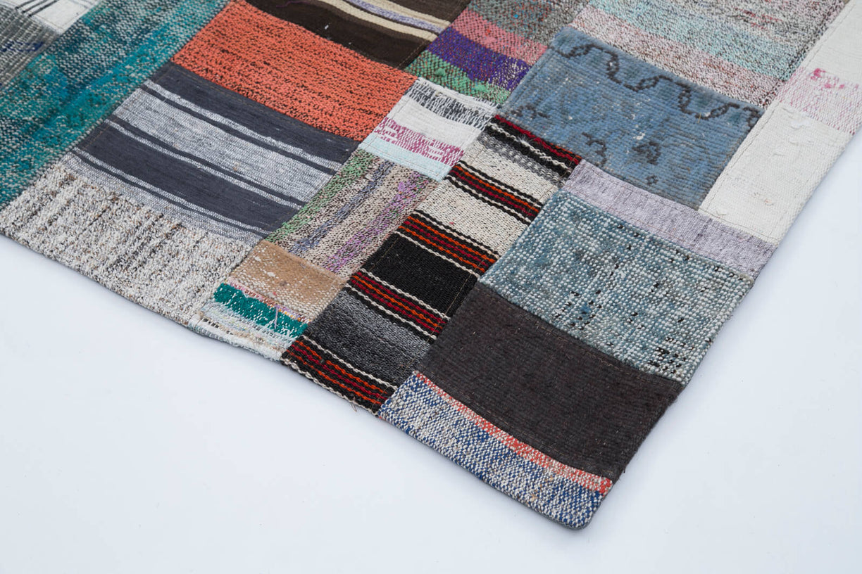Colorful patchwork rug crafted from vintage Turkish 'chaput' fragments, also known as rag rugs. These unique Turkish chaput kilims are flatweaves handmade from recycled cotton, wool, and goat hair fabrics. Originally woven on narrow looms, chaput panels were later sewn together to create two or even three-winged reversible rugs. Chaput weaving, a traditional practice in Asia Minor, creatively reuses old textiles, forming eco-friendly, one-of-a-kind pieces with rich color and texture. Historically used as runners, area rugs, or bed covers, each vintage chaput patchwork rug showcases an authentic palette, unredyed and rich in character.