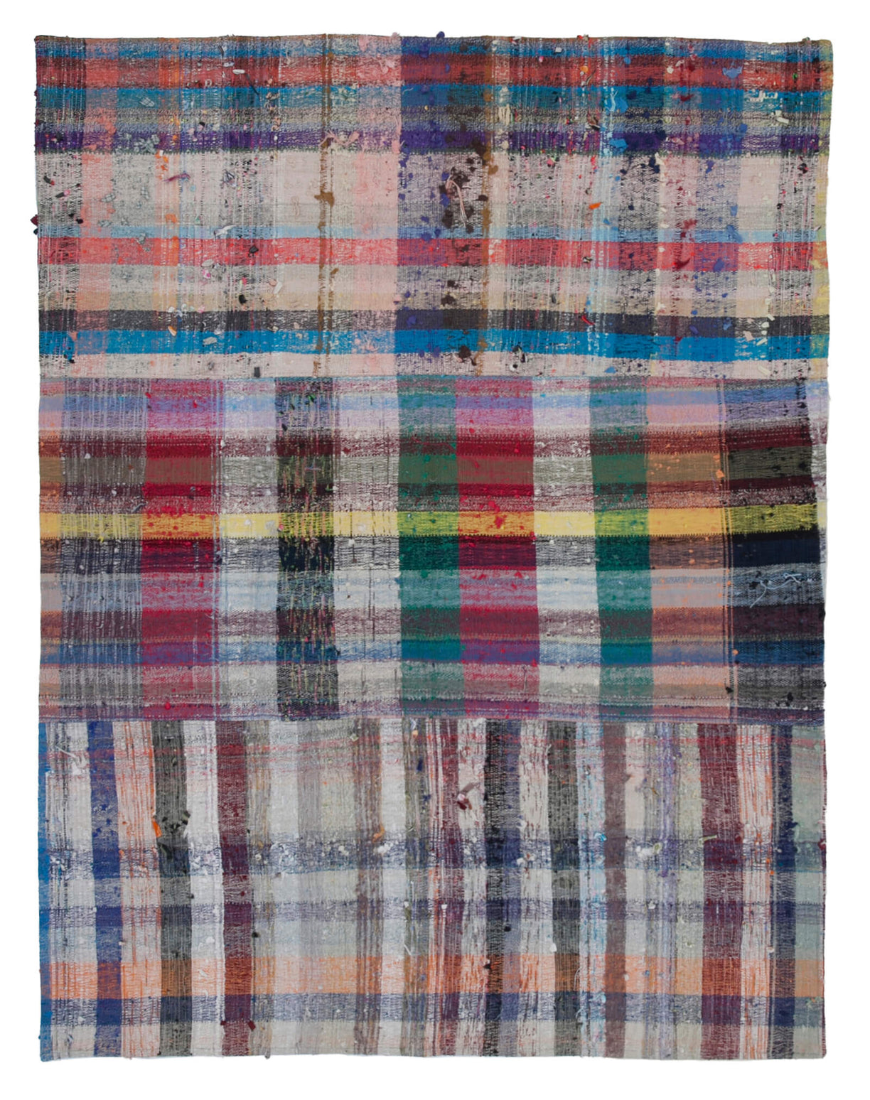 Colorful patchwork rug crafted from vintage Turkish 'chaput' fragments, also known as rag rugs. These unique Turkish chaput kilims are flatweaves handmade from recycled cotton, wool, and goat hair fabrics. Originally woven on narrow looms, chaput panels were later sewn together to create two or even three-winged reversible rugs. Chaput weaving, a traditional practice in Asia Minor, creatively reuses old textiles, forming eco-friendly, one-of-a-kind pieces with rich color and texture. Historically used as runners, area rugs, or bed covers, each vintage chaput patchwork rug showcases an authentic palette, unredyed and rich in character.