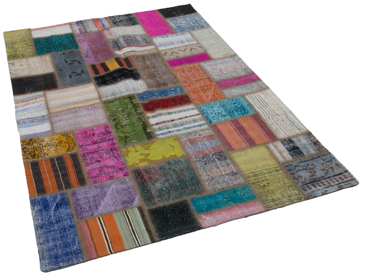 Colorful patchwork rug crafted from vintage Turkish 'chaput' fragments, also known as rag rugs. These unique Turkish chaput kilims are flatweaves handmade from recycled cotton, wool, and goat hair fabrics. Originally woven on narrow looms, chaput panels were later sewn together to create two or even three-winged reversible rugs. Chaput weaving, a traditional practice in Asia Minor, creatively reuses old textiles, forming eco-friendly, one-of-a-kind pieces with rich color and texture. Historically used as runners, area rugs, or bed covers, each vintage chaput patchwork rug showcases an authentic palette, unredyed and rich in character.