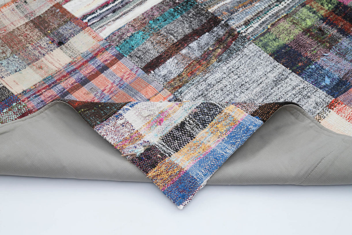 Colorful patchwork rug crafted from vintage Turkish 'chaput' fragments, also known as rag rugs. These unique Turkish chaput kilims are flatweaves handmade from recycled cotton, wool, and goat hair fabrics. Originally woven on narrow looms, chaput panels were later sewn together to create two or even three-winged reversible rugs. Chaput weaving, a traditional practice in Asia Minor, creatively reuses old textiles, forming eco-friendly, one-of-a-kind pieces with rich color and texture. Historically used as runners, area rugs, or bed covers, each vintage chaput patchwork rug showcases an authentic palette, unredyed and rich in character.