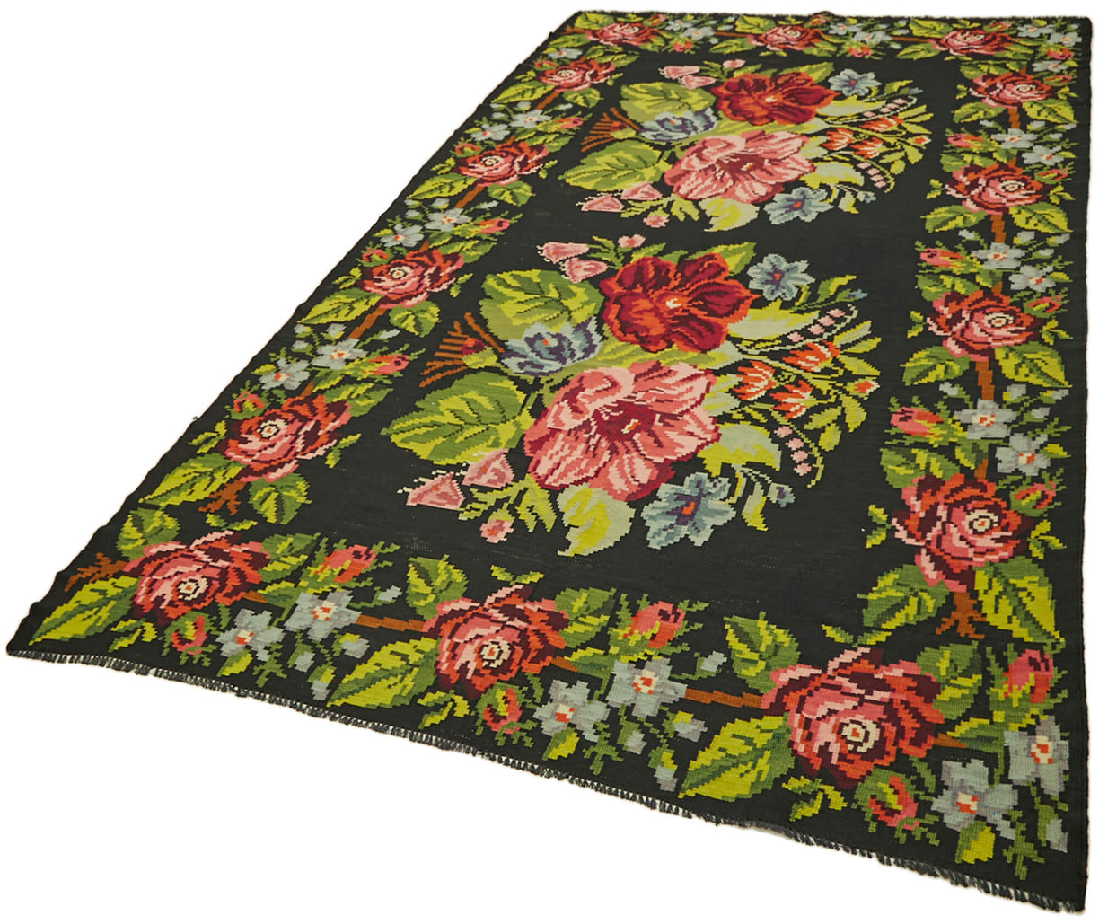 Elegant Floral Handwoven Wool Rug, hand-woven in the 70s, featuring a vibrant floral pattern and rich colors. This vintage rug is in excellent condition and perfect for adding a touch of bohemian or eclectic flair to any space. A rug pad is recommended for added comfort and durability.