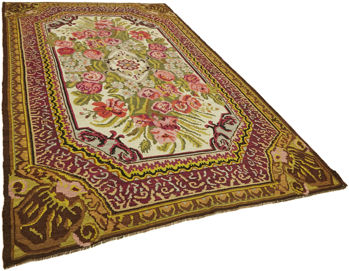 Transform your space with the enchanting beauty of this vintage floral kilim rug, handcrafted in 1970s Moldova. Bursting with vibrant hues and intricate patterns, it effortlessly complements bohemian and eclectic decor styles. Despite its age, this rug is exceptionally well-preserved, offering both charm and durability. Enhance its longevity and comfort with a rug pad, ensuring it remains a cherished centerpiece in your home for years to come. Embrace the rich history and timeless appeal of this captivating kilim rug today.