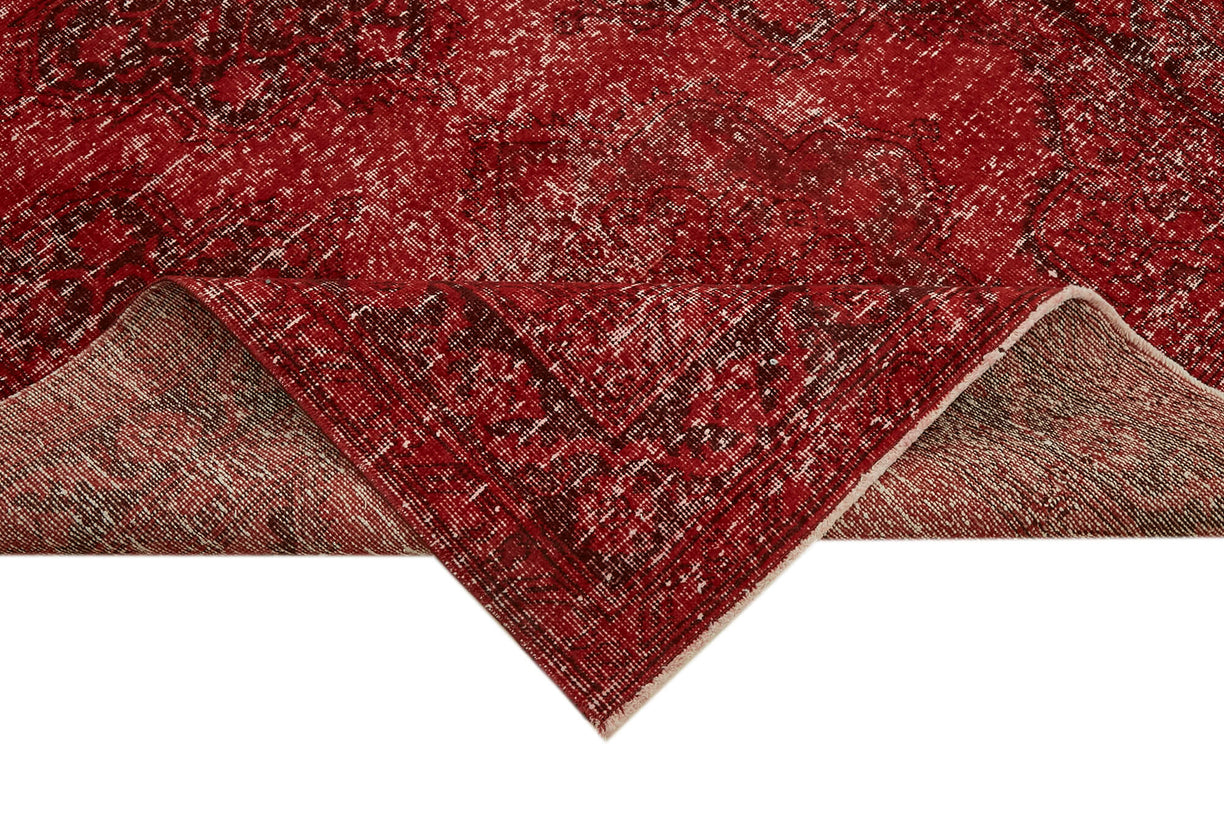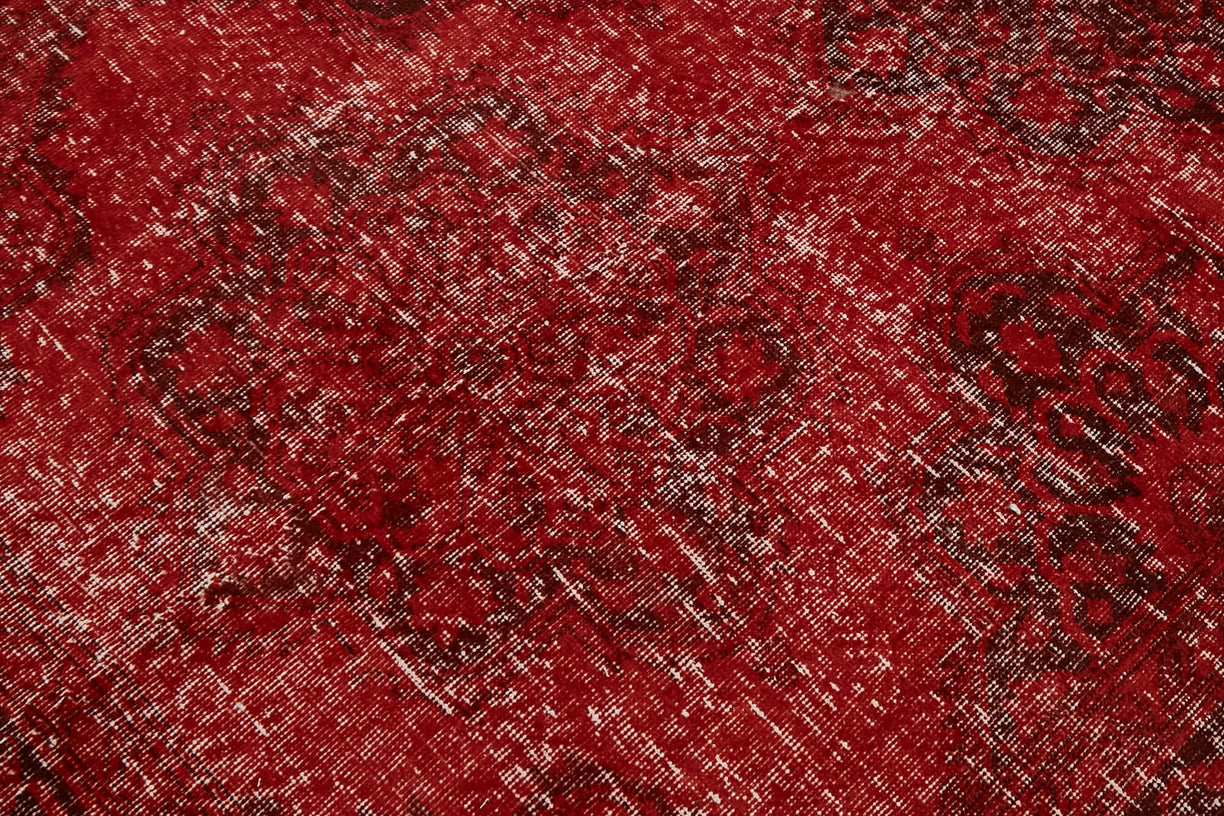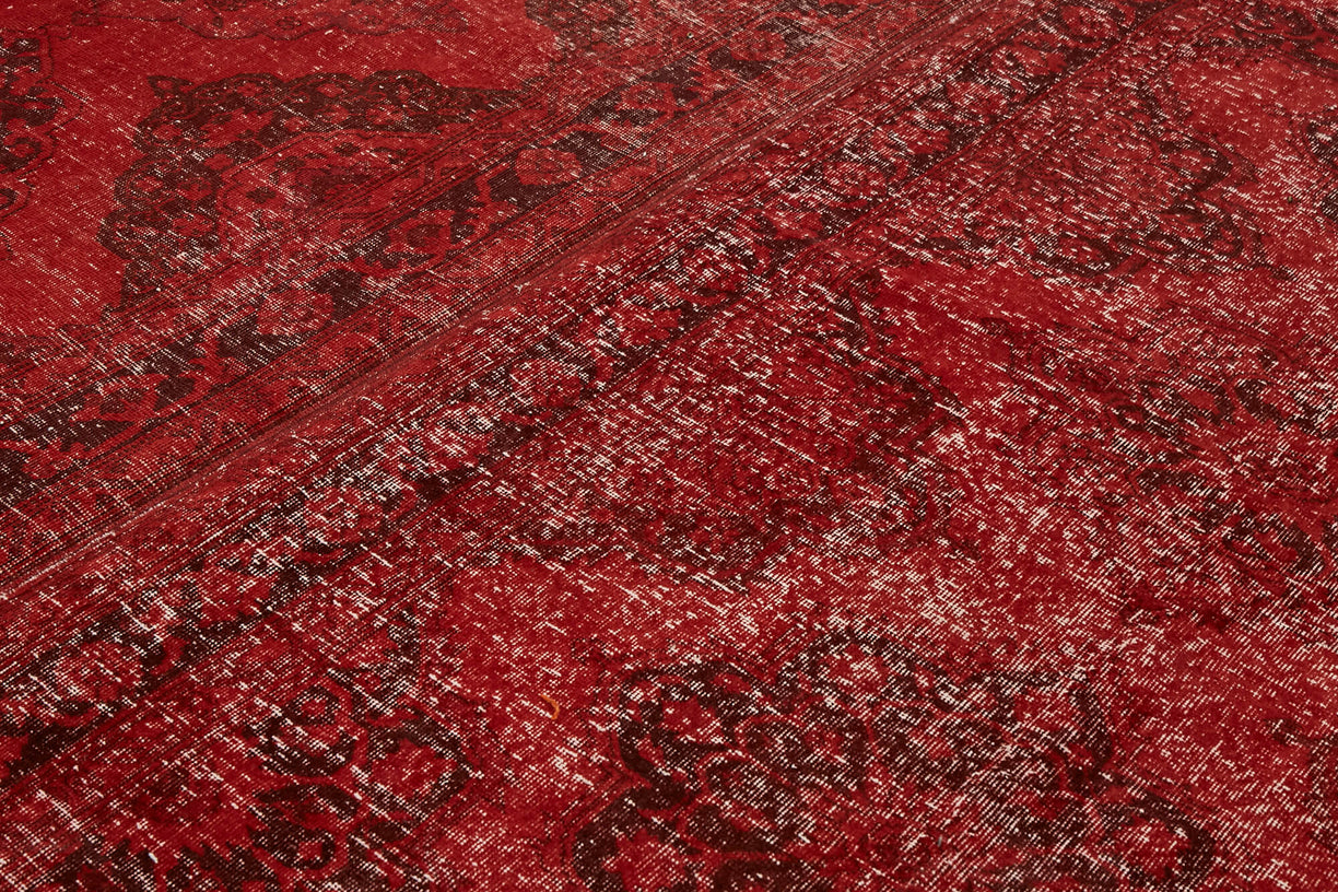 This red over-dyed rug offers a contemporary look with abstract appeal, crafted from a hand-knotted vintage Oriental rug from the 1960s. it measures 9' 6'' x 12' 4''. The rug undergoes a unique process to lower the pile, desaturate the color, and achieve the perfect hue. This transformation bridges generations of artisanal skill, making it a unique statement piece for modern décor. All our vintage rugs are professionally cleaned before being added to our collection.