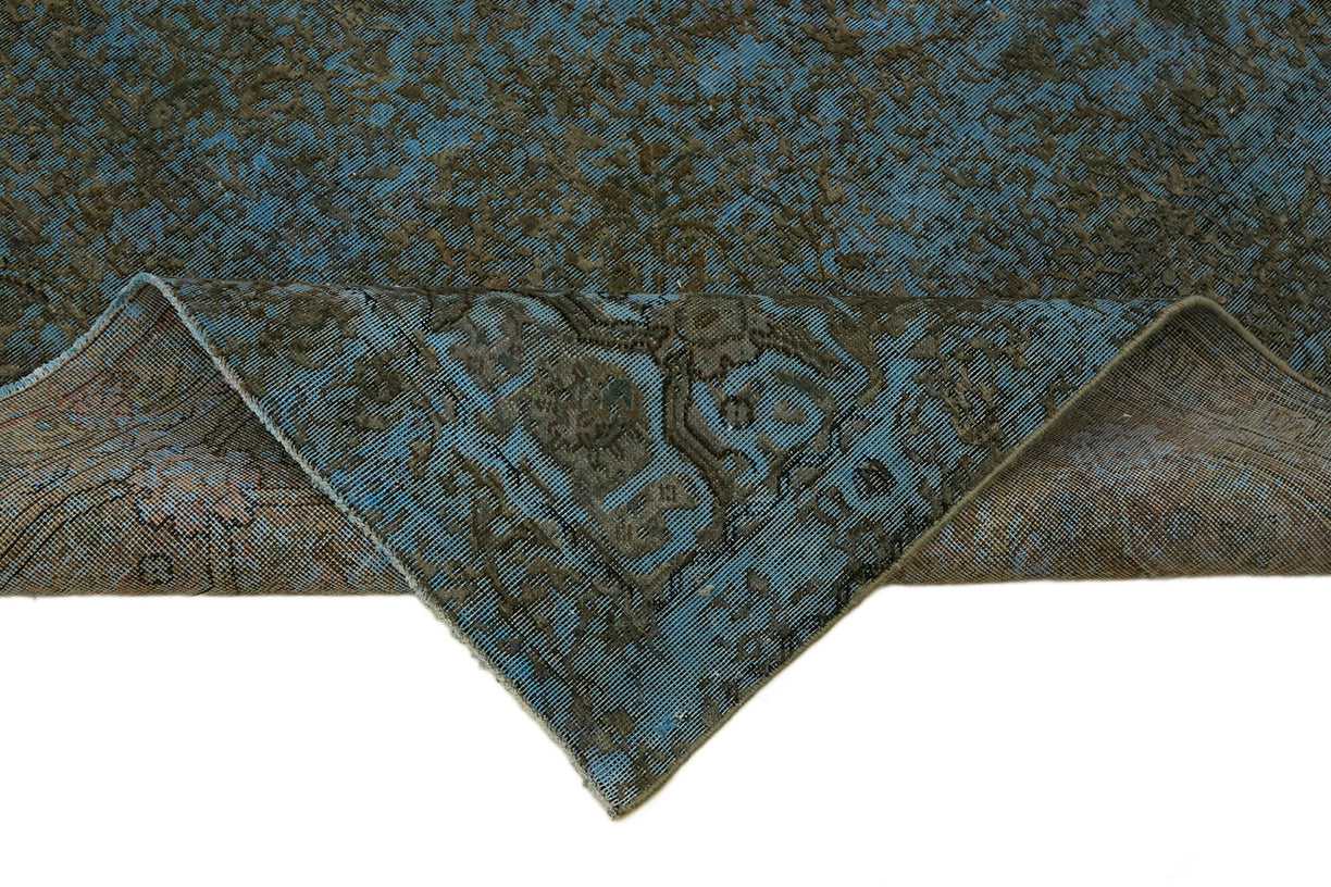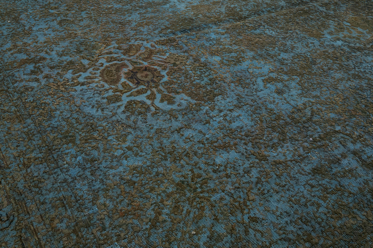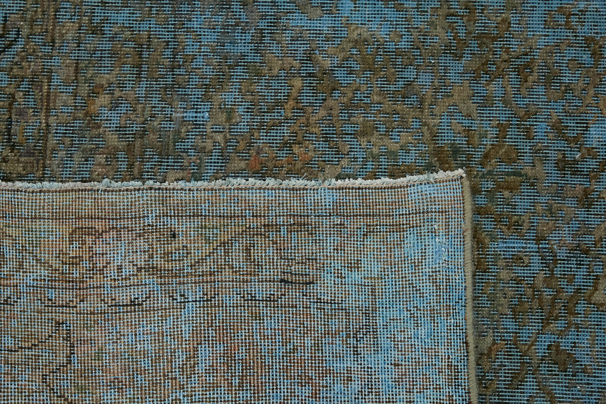 This blue over-dyed rug offers a contemporary look with abstract appeal, crafted from a hand-knotted vintage Oriental rug from the 1960s. it measures 9' 8'' x 12' 9''. The rug undergoes a unique process to lower the pile, desaturate the color, and achieve the perfect hue. This transformation bridges generations of artisanal skill, making it a unique statement piece for modern décor. All our vintage rugs are professionally cleaned before being added to our collection.