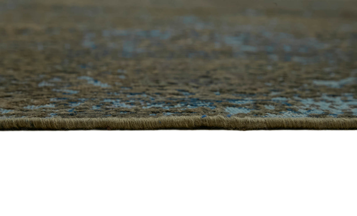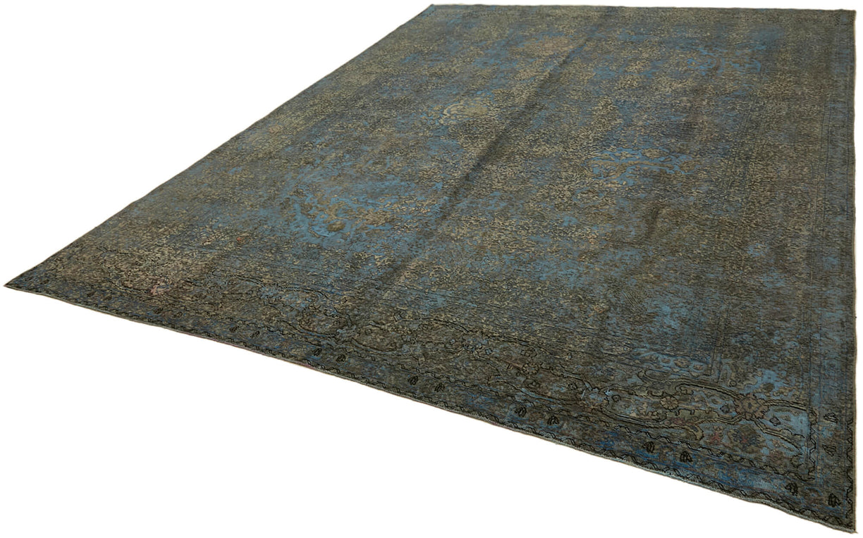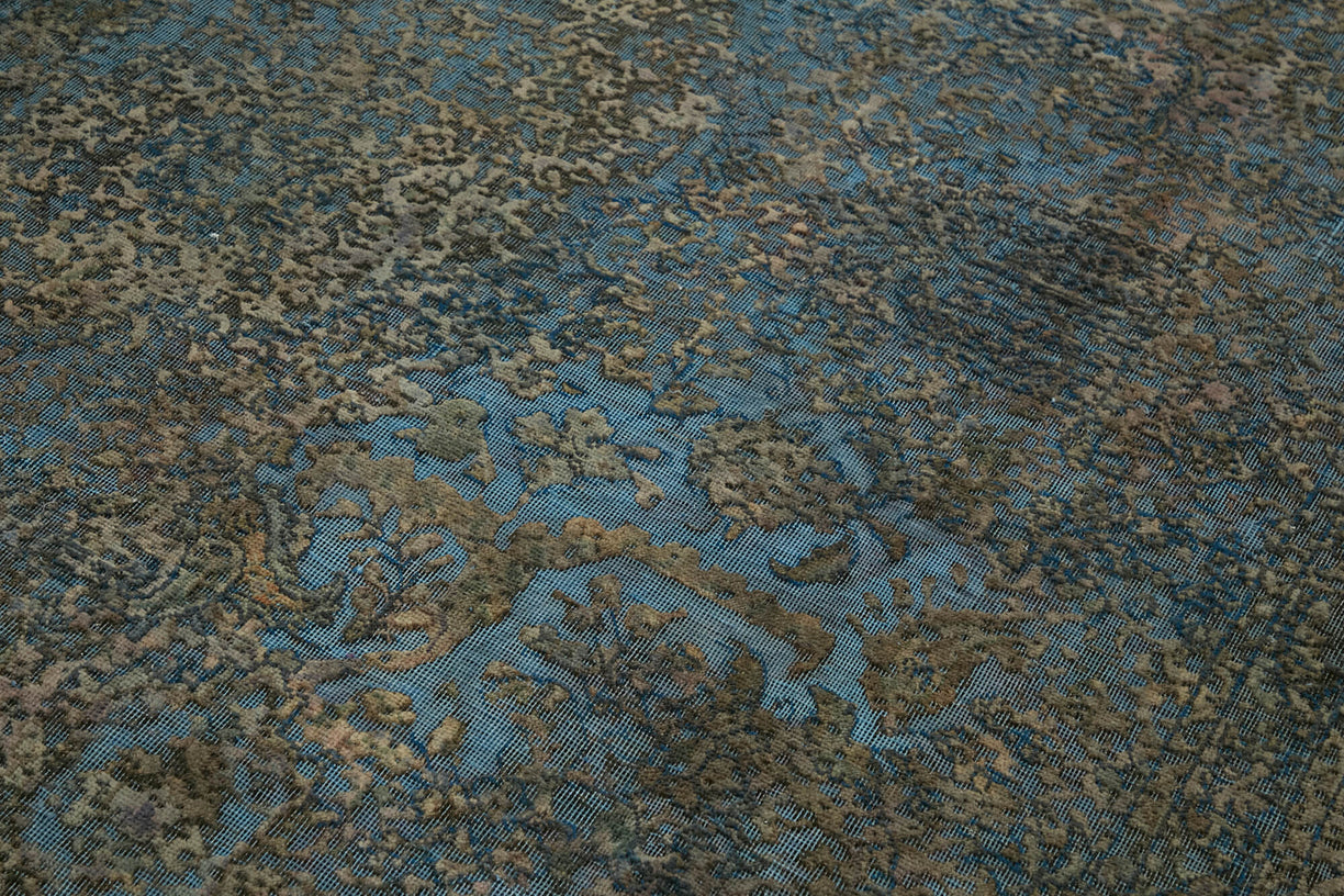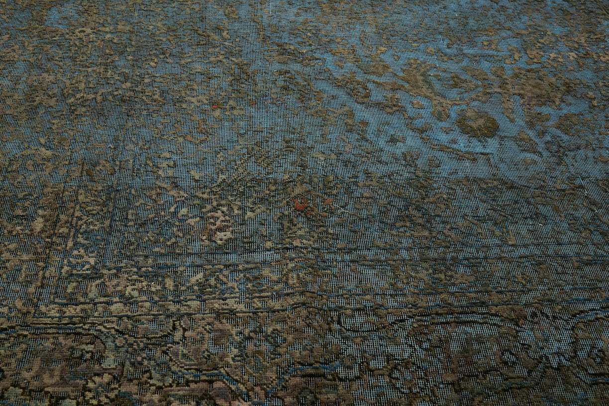 This blue over-dyed rug offers a contemporary look with abstract appeal, crafted from a hand-knotted vintage Oriental rug from the 1960s. it measures 9' 8'' x 12' 9''. The rug undergoes a unique process to lower the pile, desaturate the color, and achieve the perfect hue. This transformation bridges generations of artisanal skill, making it a unique statement piece for modern décor. All our vintage rugs are professionally cleaned before being added to our collection.