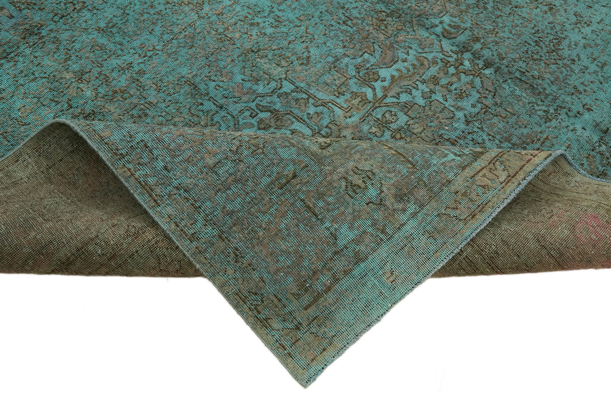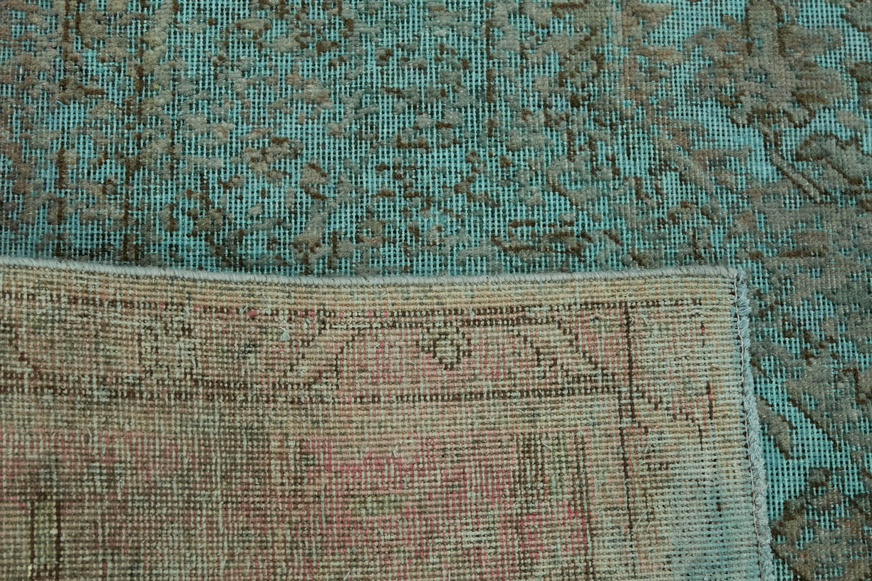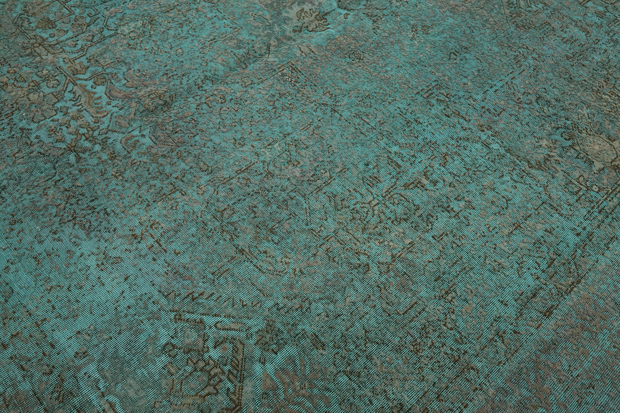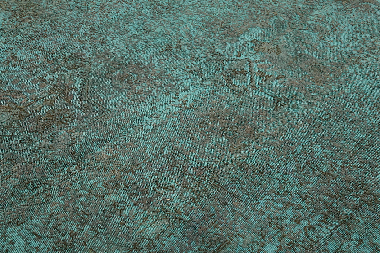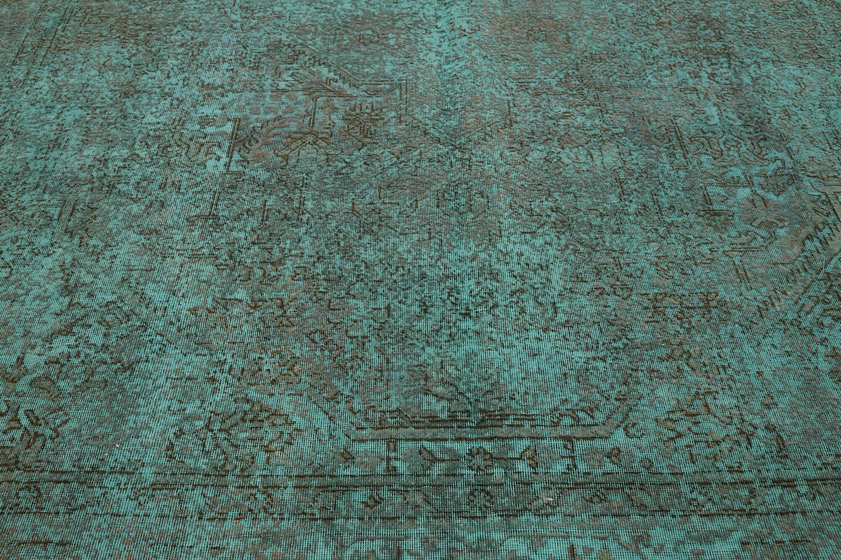 This turquoise over-dyed rug offers a contemporary look with abstract appeal, crafted from a hand-knotted vintage Oriental rug from the 1960s. it measures 9' 7'' x 12' 8''. The rug undergoes a unique process to lower the pile, desaturate the color, and achieve the perfect hue. This transformation bridges generations of artisanal skill, making it a unique statement piece for modern décor. All our vintage rugs are professionally cleaned before being added to our collection.