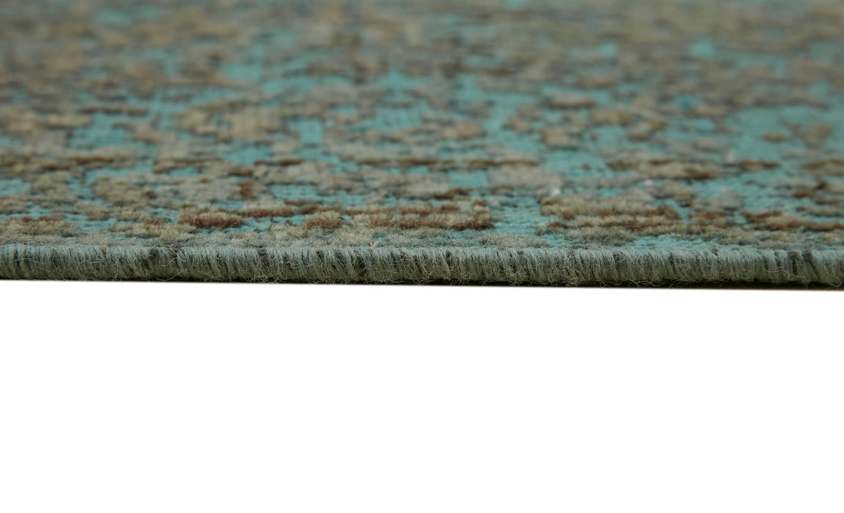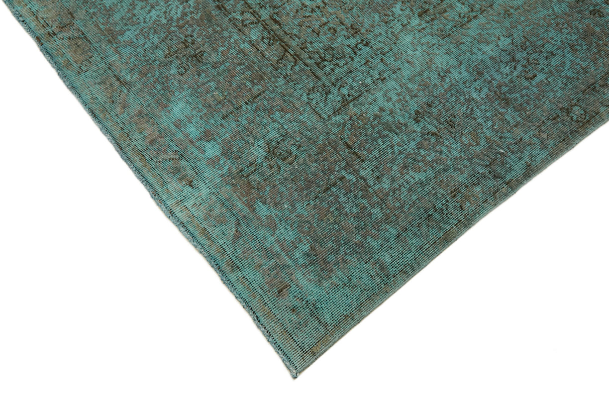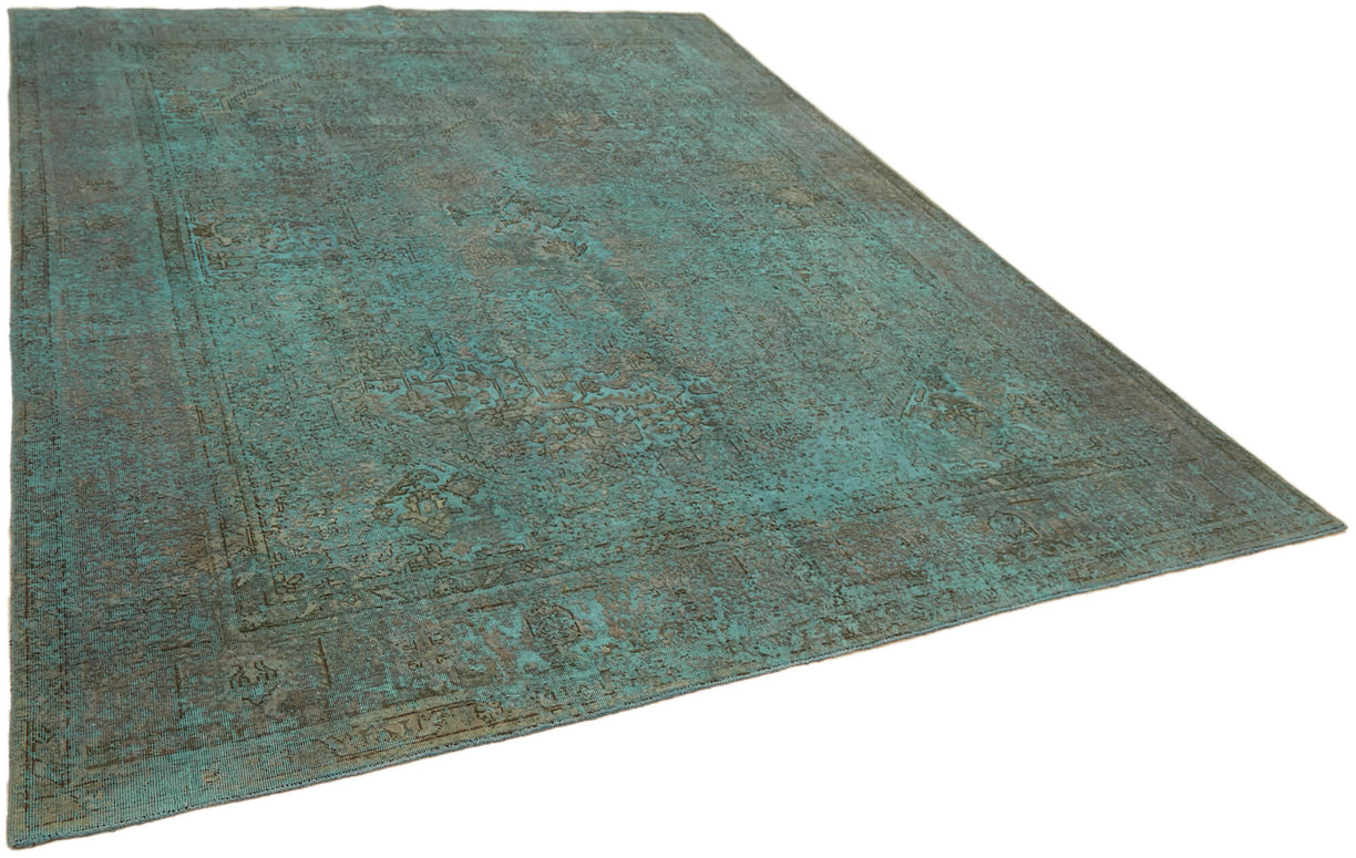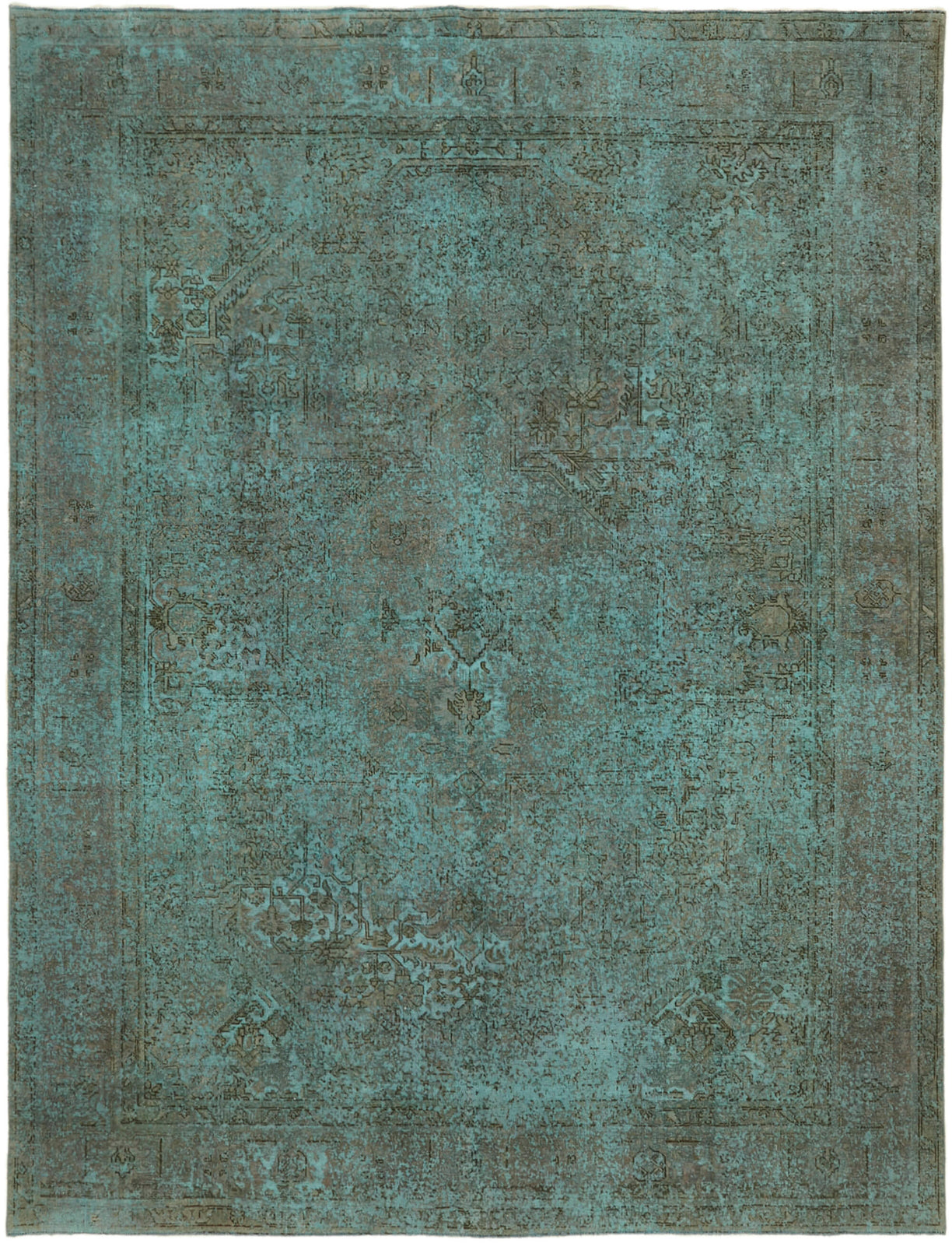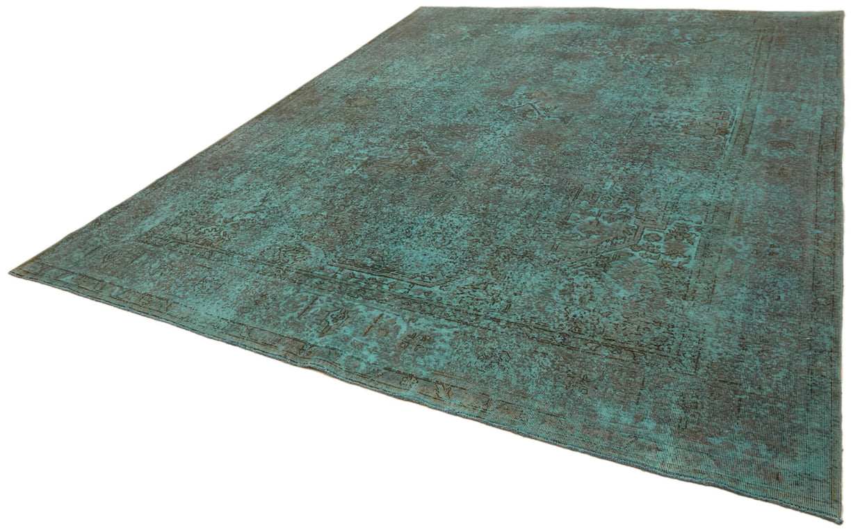 This turquoise over-dyed rug offers a contemporary look with abstract appeal, crafted from a hand-knotted vintage Oriental rug from the 1960s. it measures 9' 7'' x 12' 8''. The rug undergoes a unique process to lower the pile, desaturate the color, and achieve the perfect hue. This transformation bridges generations of artisanal skill, making it a unique statement piece for modern décor. All our vintage rugs are professionally cleaned before being added to our collection.