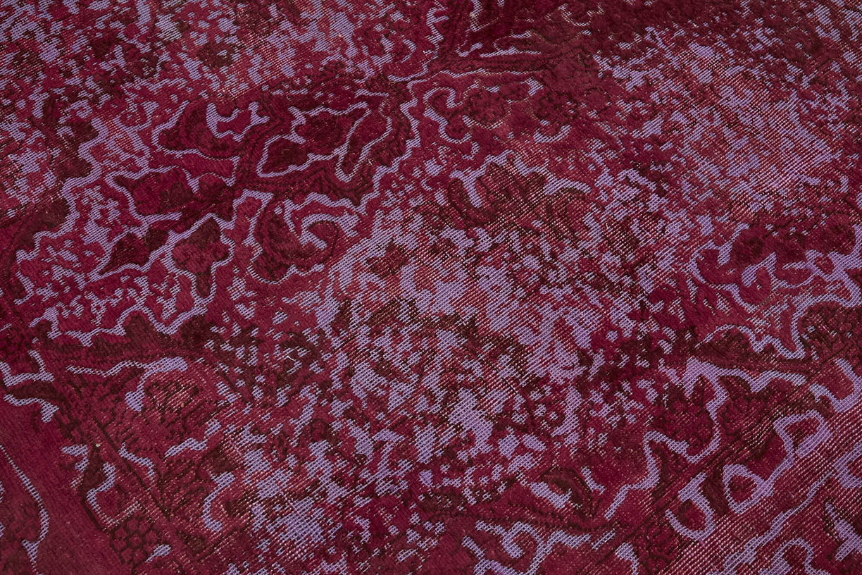 This red over-dyed rug offers a contemporary look with abstract appeal, crafted from a hand-knotted vintage Oriental rug from the 1960s. it measures 6' 1'' x 9' 5''. The rug undergoes a unique process to lower the pile, desaturate the color, and achieve the perfect hue. This transformation bridges generations of artisanal skill, making it a unique statement piece for modern décor. All our vintage rugs are professionally cleaned before being added to our collection.